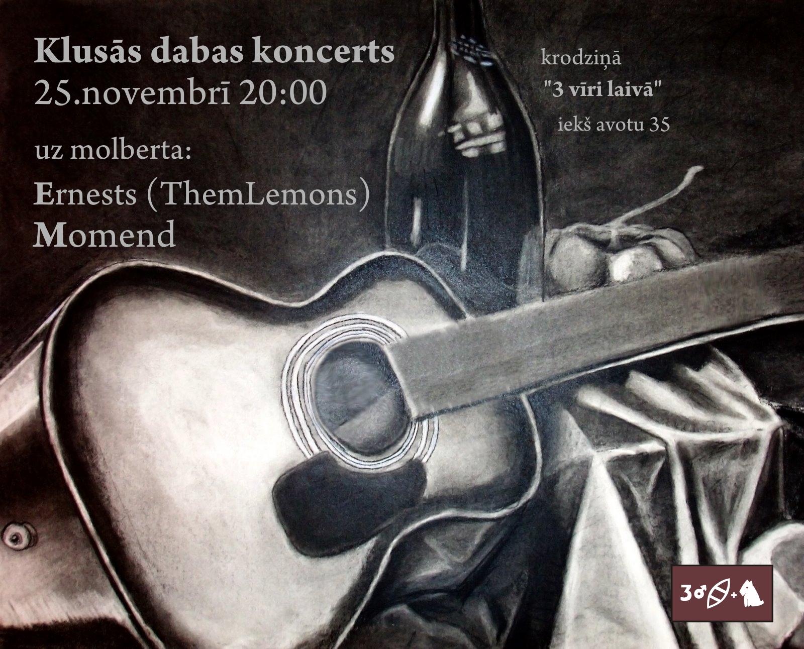 Krodziņā “Trīs vīri laivā” uzstāsies divu grupu līderi ar savu solo repertuāru – Gatis no “Nepilngadīgās Annas” (anarho folk) un Juris no “Bērnības milicijas” (indie rock). Gatim šis būs individuālo dziesmu pirmatskaņojums plašākai publikai, Jurim viens no retajiem koncertiem ar savu repertuāru. Ar Gati kopā uzstāsies cilvēks ar mežragu.