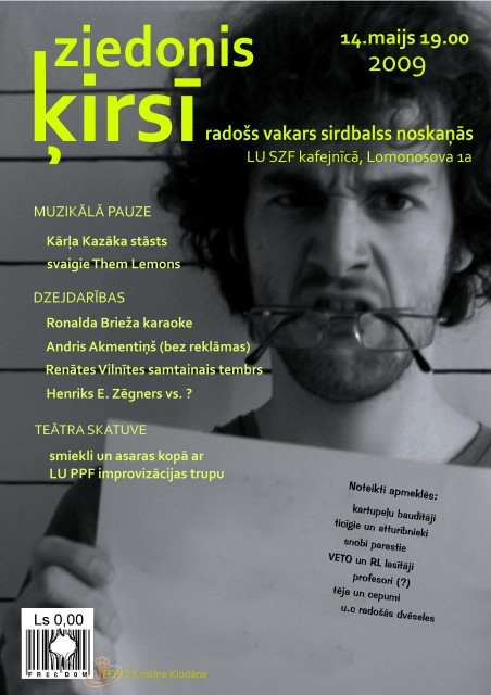 Pavasara pirmās indikācijas uzrāda, ka aprīļa beigās krodziņā “3 vīri laivā” norisināsies leģendārais kultūras ekspresiju pasākums “Ziedonis ķirsī”. Līdz šim tas notika LU Sociālo zinātņu fakultātē, bet šis gads jūtami prasa pārmaiņas.  LU SZF kafejnīca ir maza, tur nav aparatūras un alkohola..